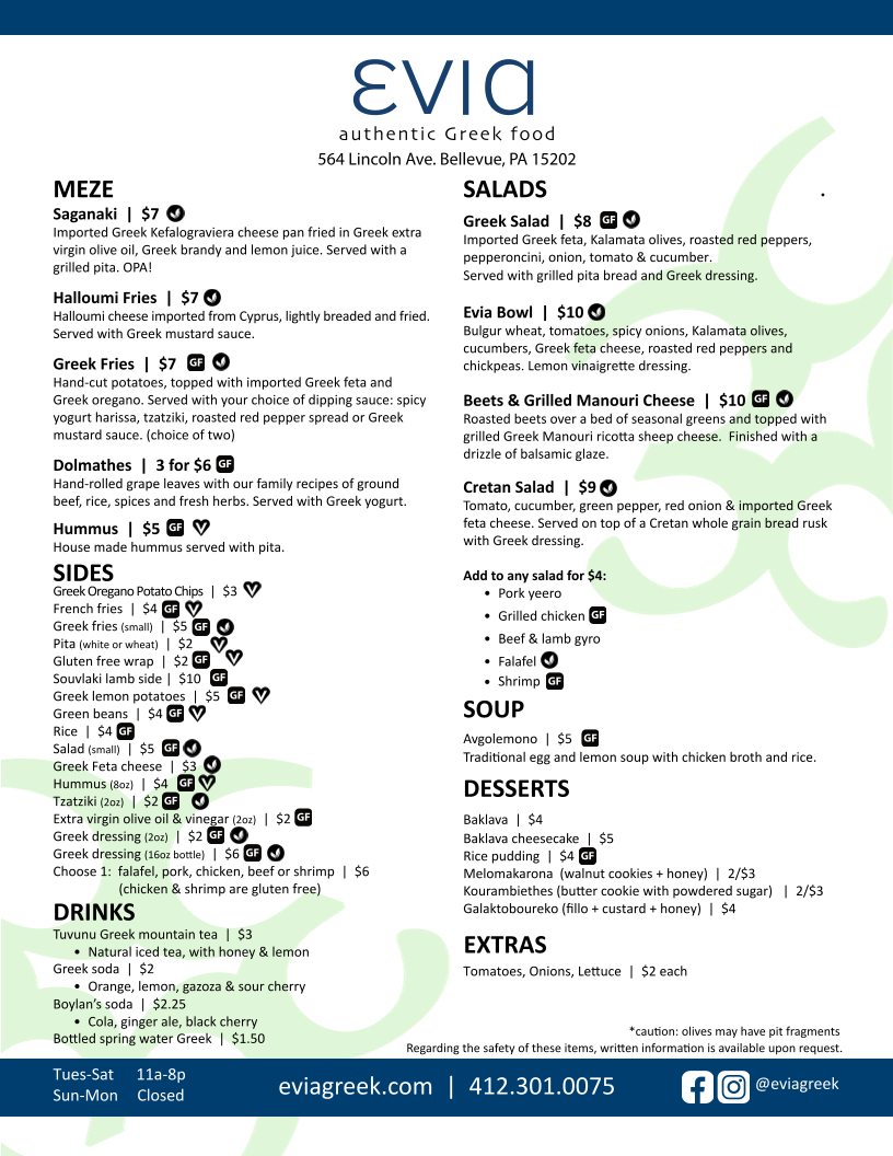 EVIA Greek Restaurant offers an authentic taste of Greece right in Bellevue, PA, with a menu that celebrates traditional flavors and fresh ingredients. Start your meal with classic meze like Saganaki, featuring imported Kefalograviera cheese pan-fried with olive oil and brandy, or Halloumi Fries, crisp and paired with Greek mustard sauce. Their Greek Fries, topped with feta and oregano, highlight local twists on beloved dishes.